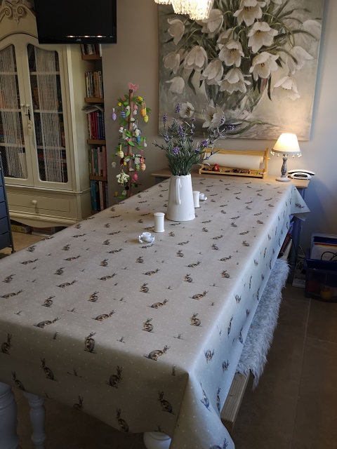 Made from 100% cotton fabric, our Sandringham Hare Matt Oilcloth Tablecloth is coated in the UK with child friendly non-phthalate coatings. Approx 132cms wide.