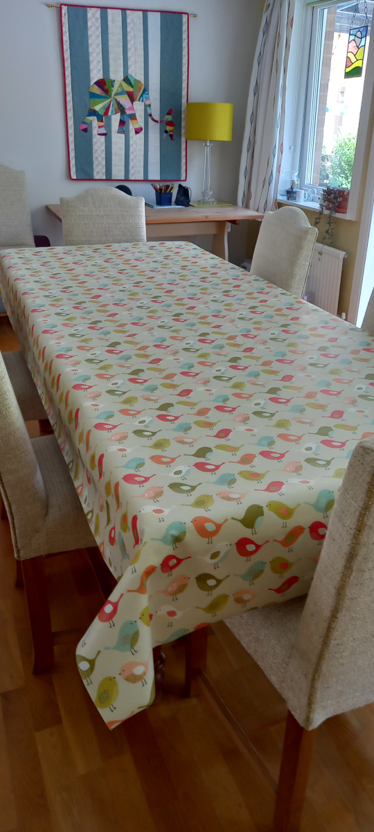 - June 2025 Winner – Hilary D sent us a bright and cheerful table dressed in our Scandi Birds Mustard Oilcloth Tablecloth